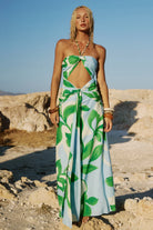 Embrace effortless elegance with our tropical-inspired maxi dress, featuring a flattering cut-out design and a tie-front detail for a breezy, Summer look.