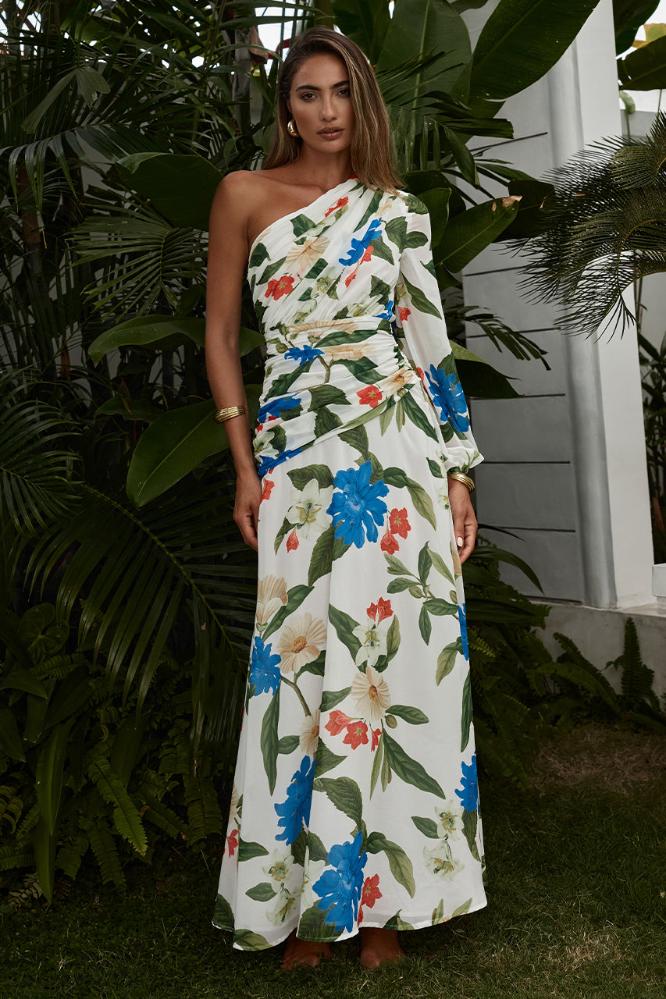 Our Floria Maxi Dress features a one-shoulder neckline with ruching around the waist all in a bold floral print, perfect for your next event.