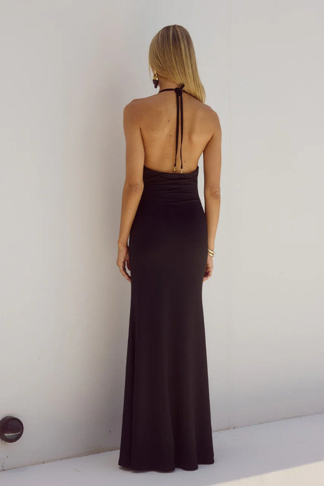 The Halston Maxi Dress brings elevated edge in classic black, featuring bold cut-outs that make it a standout choice for party season.