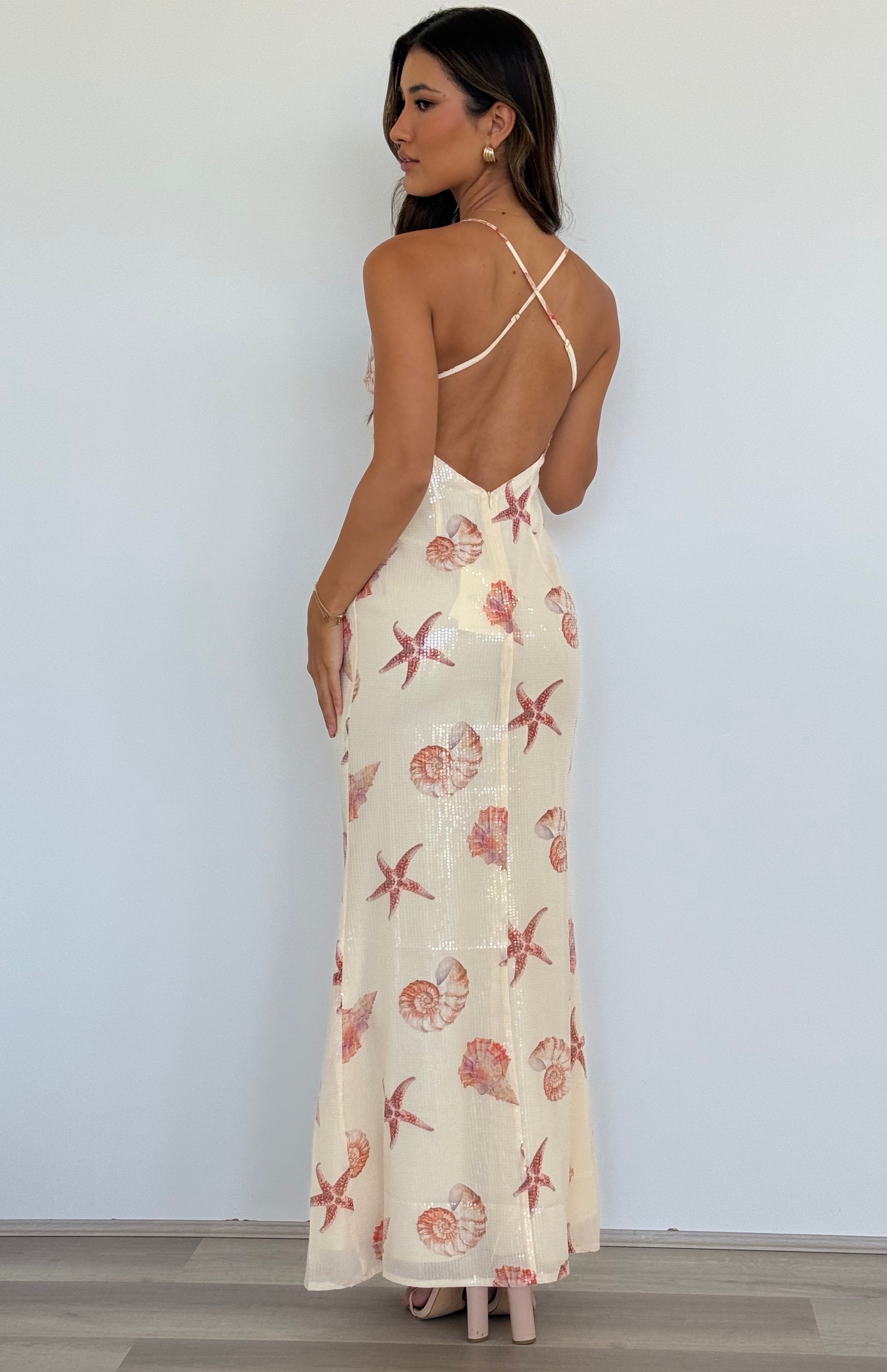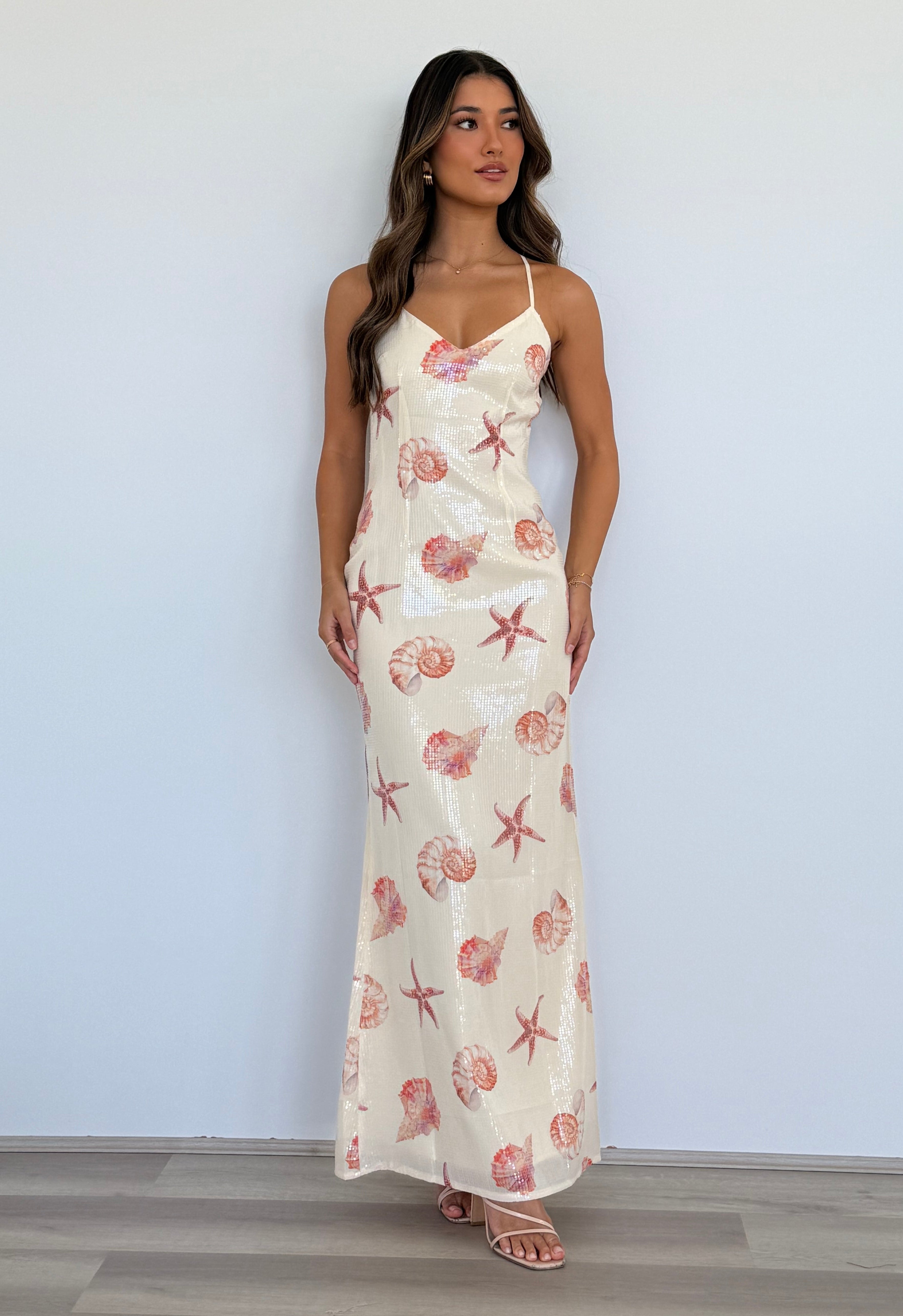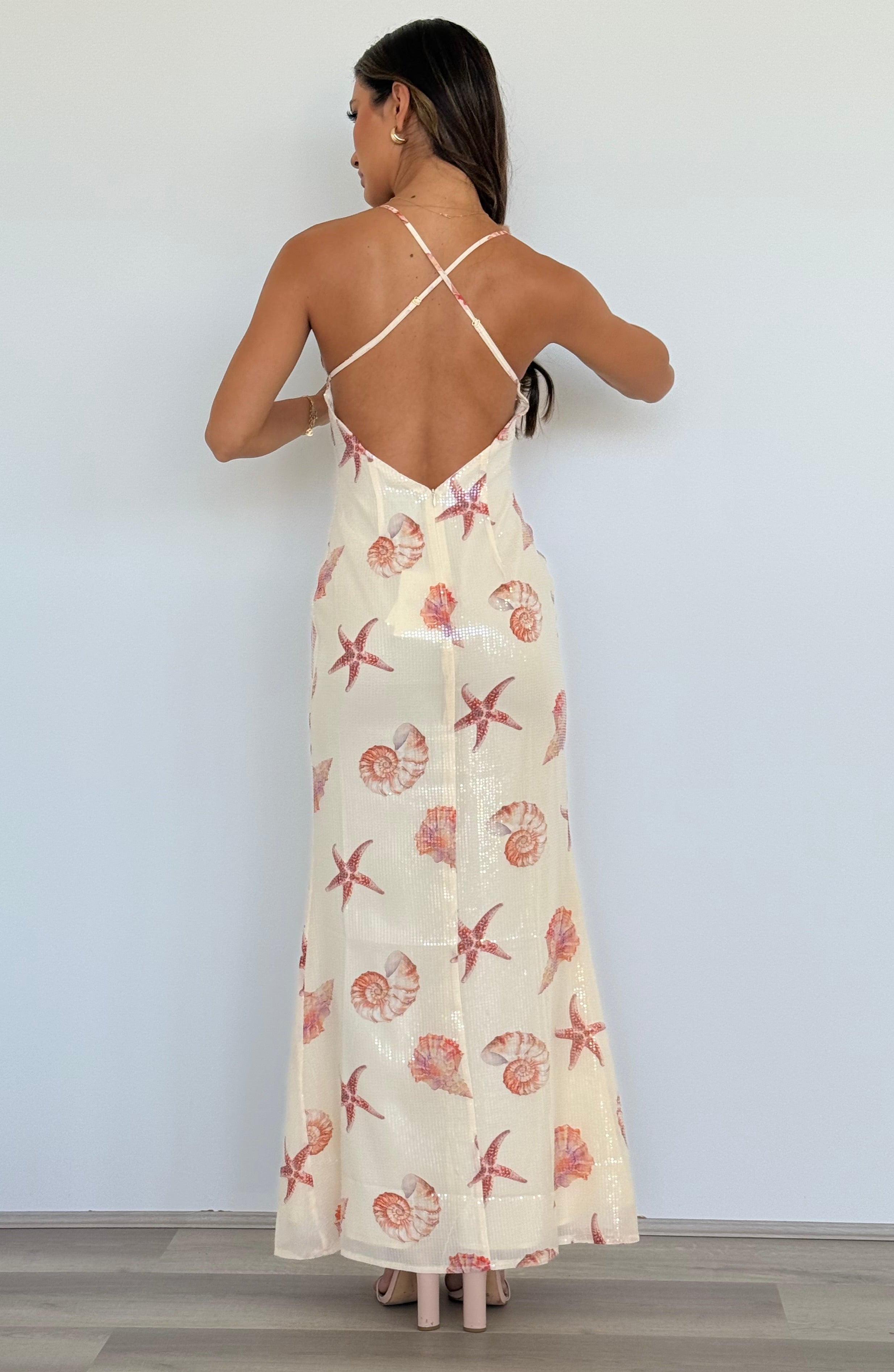 Ocean inspired motifs and colours with a glistening sequin overlay, our Niyah Maxi Dress will make a beautiful piece for a seaside wedding.