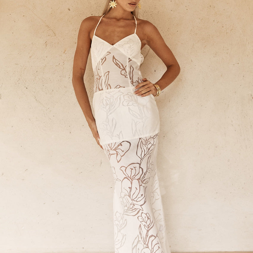 Featuring a sheer floral print with lined panels, our Sivan Maxi Dress features a low open back for a sexy hit to this feminine piece.