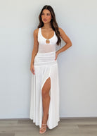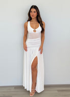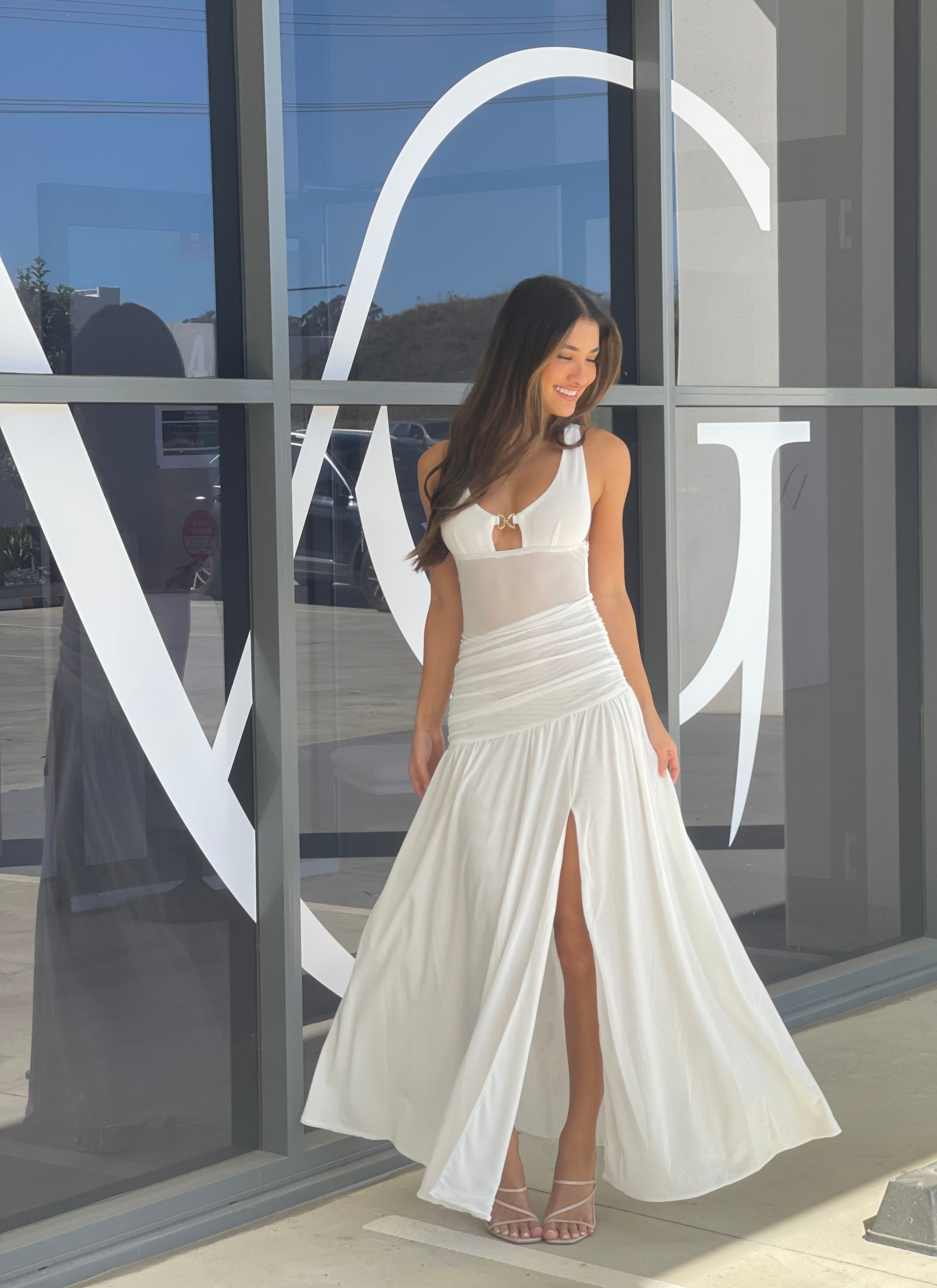 Crafted from luxe mesh with a side split and keyhole cut-out, the Denver Maxi Dress is a sleek, edgy choice for any formal occasion.