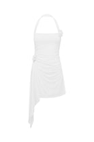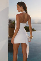 The Justina Mini Dress is a chic white halter dress with a wrap design, flower accents, and a thigh-high slit, perfect for any special occasion.