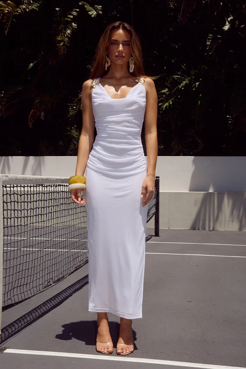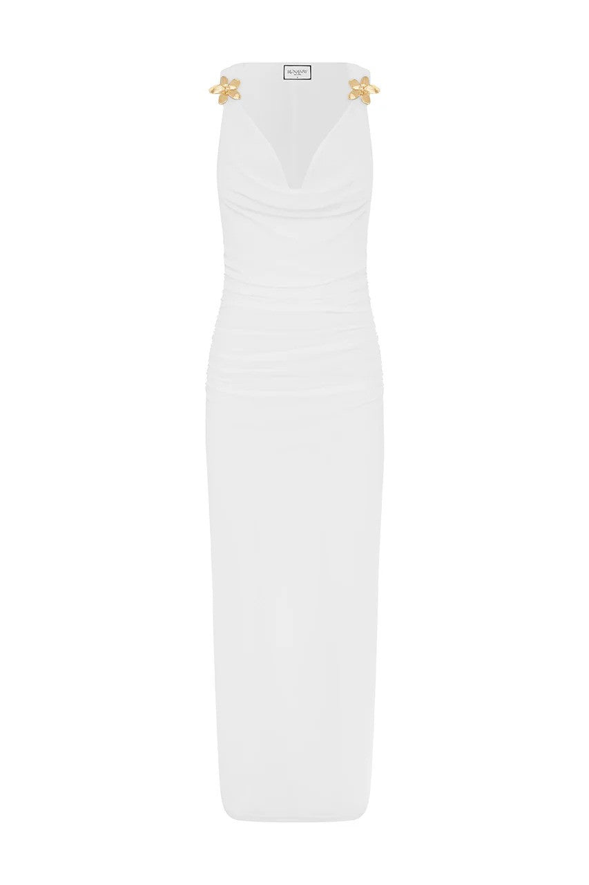 Gracefully detailed with soft ruching, a refined side split, and delicate gold floral hardware, our Balin Midi Dress transitions effortlessly from sunlit luncheons to enchanting evenings under the stars.