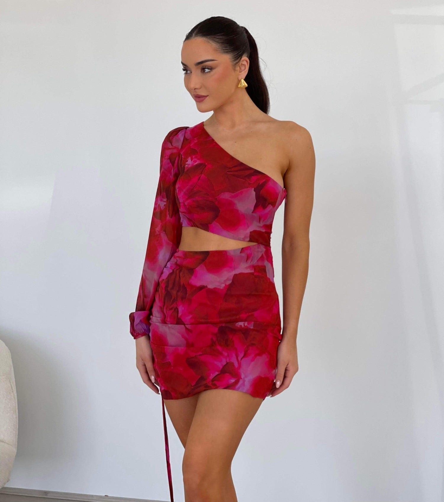 Our Calista Mini Dress features a mini length, an asymmetrical neckline with one shoulder long sleeve and an invisible side seam zipper. This is a perfect pick for your next event.
