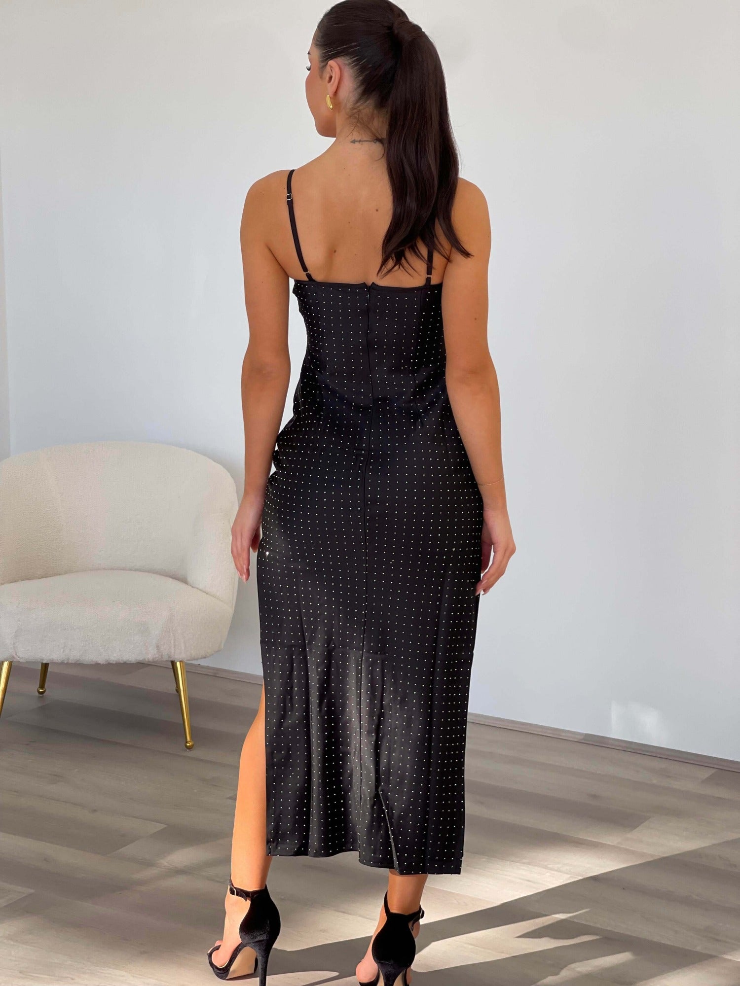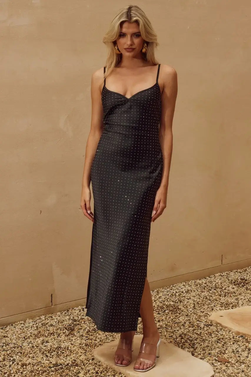 - Black long midi dress.