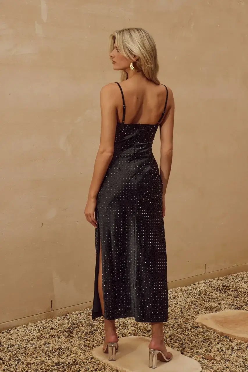 Runaway Kalina Midi Dress features a midi length, crystal embellishments and v neckline. Wear this party dress for your next special event to turn heads over.