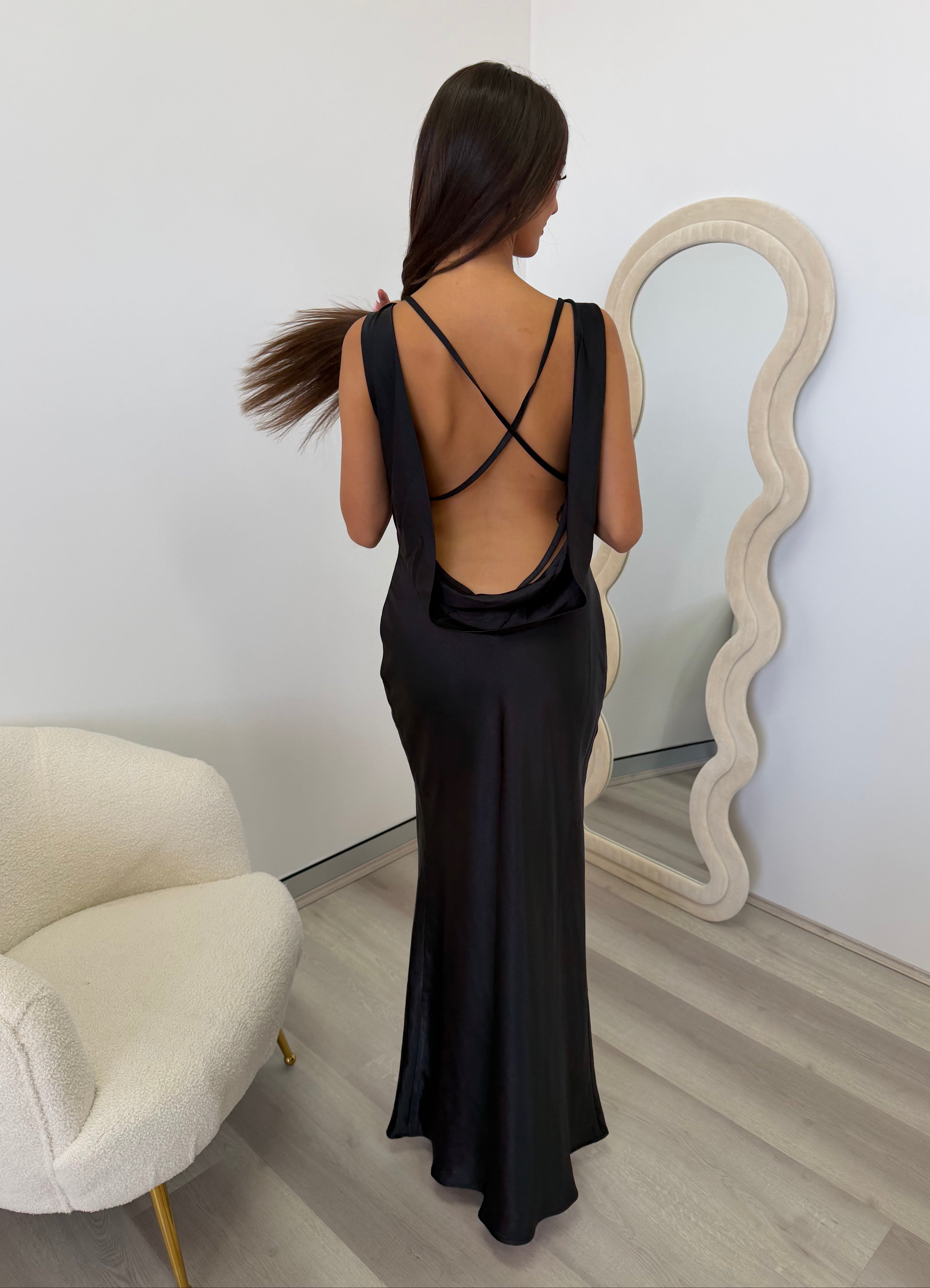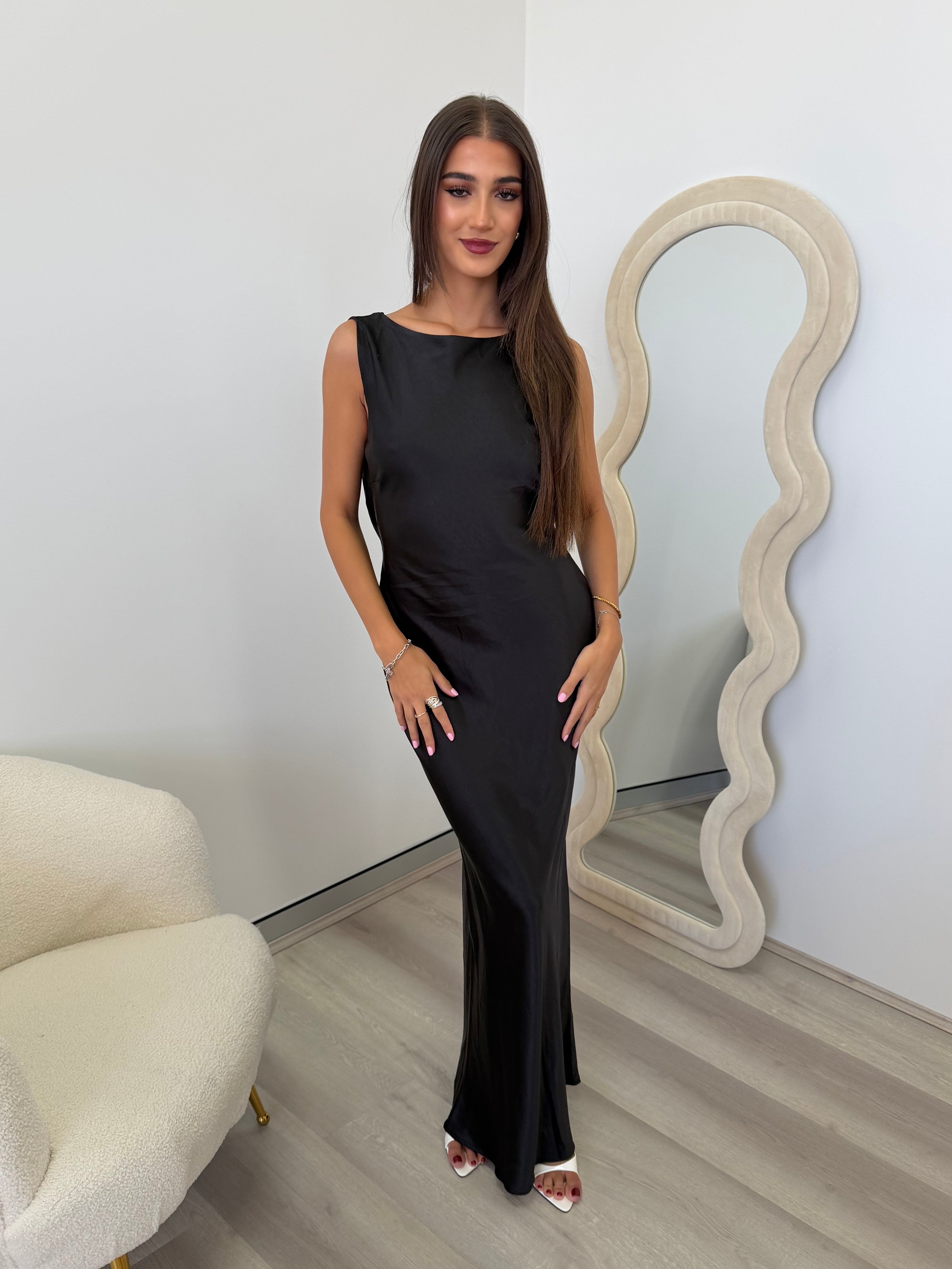 Our Adair Maxi Dress skims the body, featuring an elegant boat neckline and open back with tie detail, perfect for a wedding.