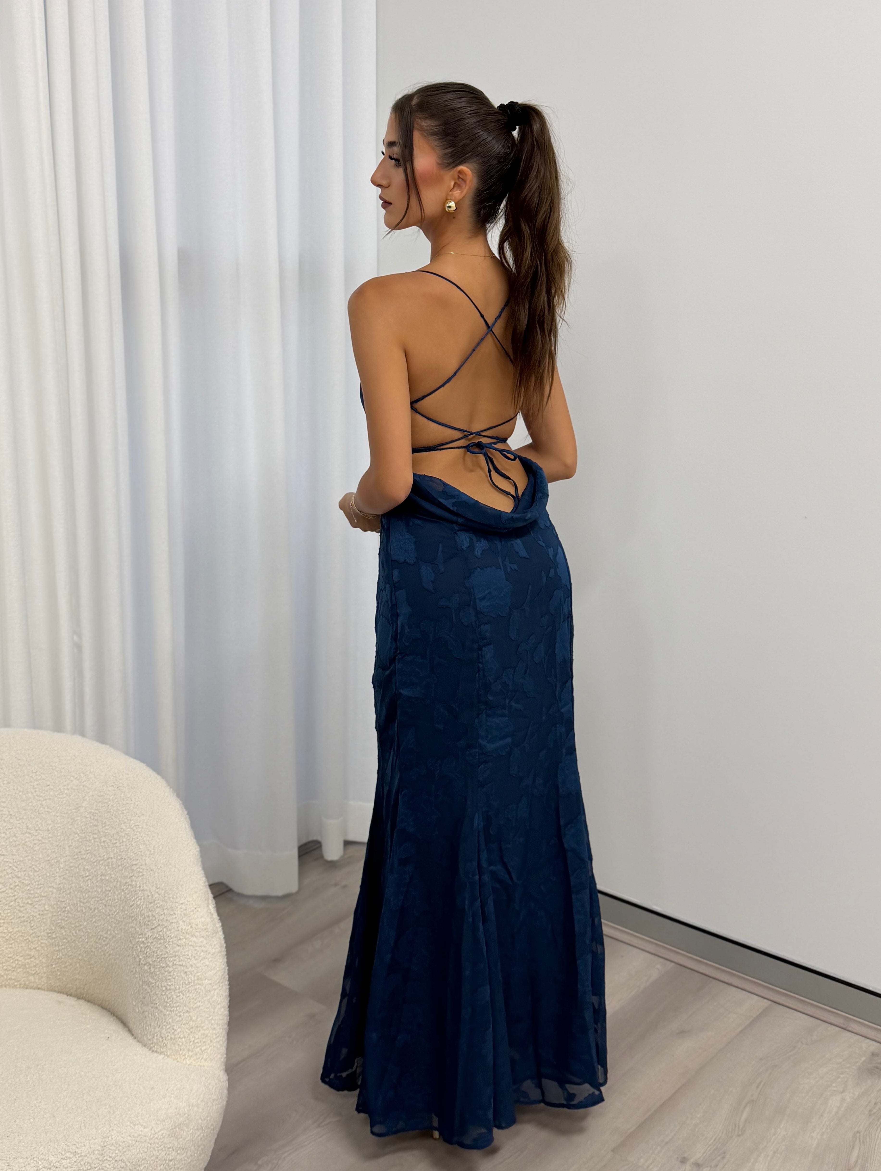 Understated with subtle detail, our Florenza Maxi Dress features delicate floral textures with a laced up open back.