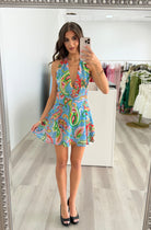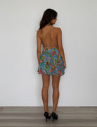 The Imali Mini Dress is your go-to for a girls' night out, featuring a flirty cowl neck, frilled skirt, open back, and a playful paisley print.