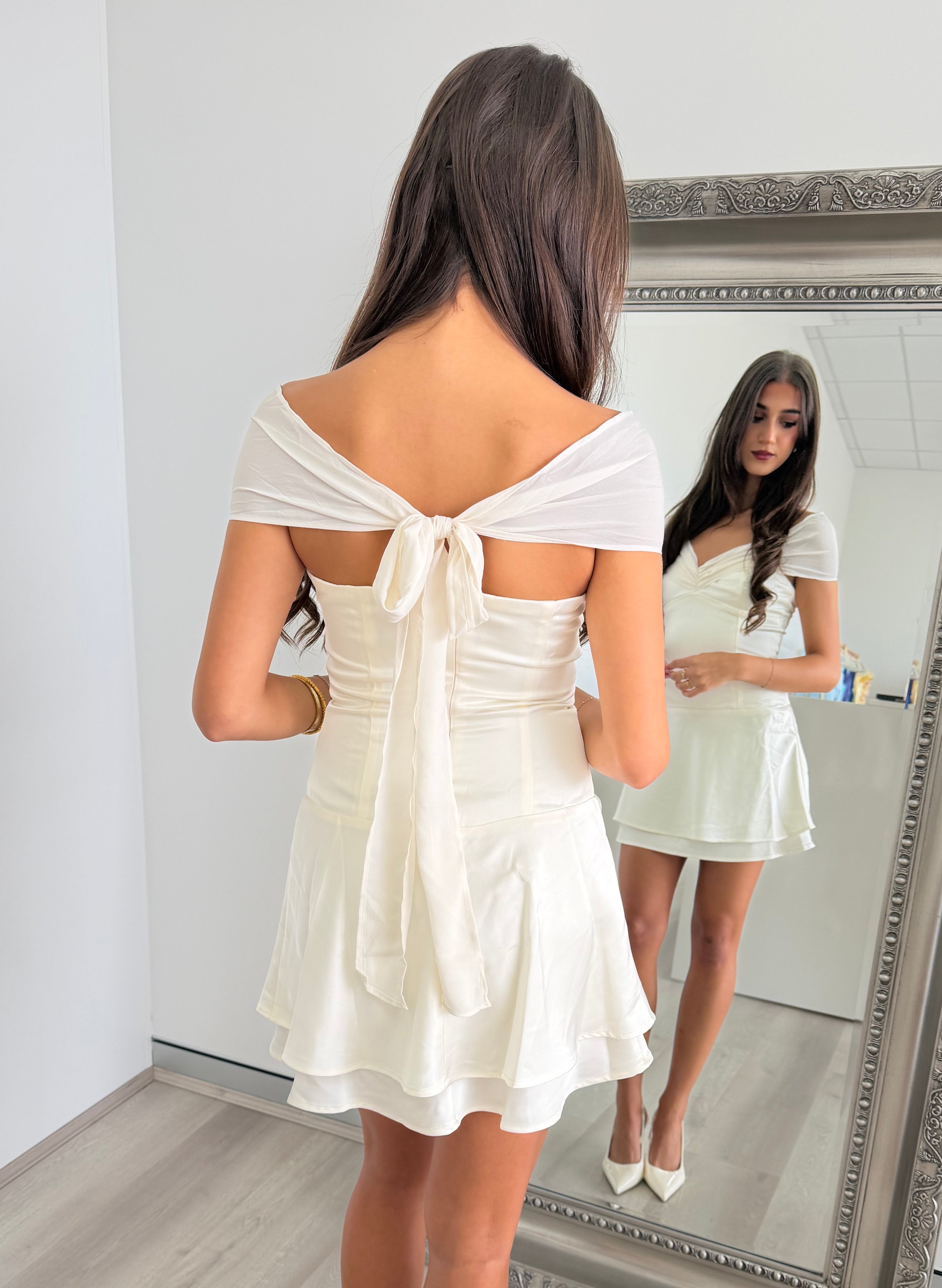 The Kadie Mini Dress, crafted in silky satin, offers versatile styling drape it off the shoulder or tie it at the bust. Soft, sweet, and effortlessly feminine.