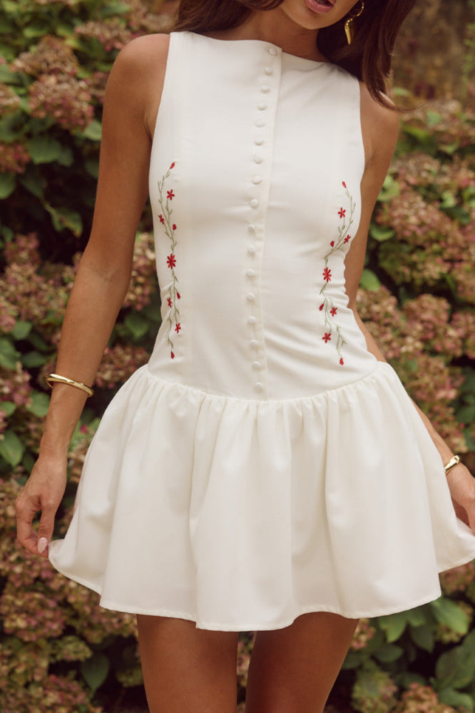A tight bodice with embroidered flowers and a voluminous skirt, our Nevah Mini Dress is feminine and flirty.