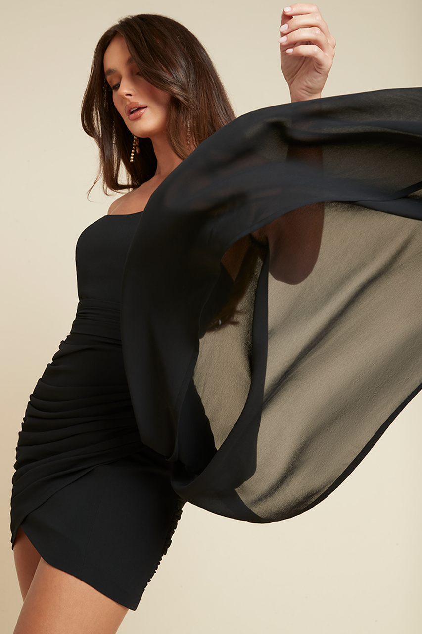 - Overlay ruched skirt with drape and zipper. This garment has lining and no stretch.