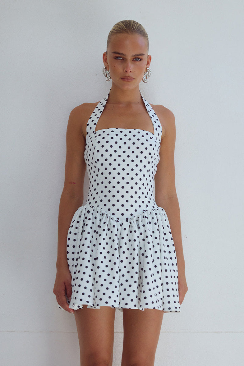 In a timeless polka dot print, our Winslow Mini Dress features a curved waistline with ruching to create a full skirt for a feminine feel.