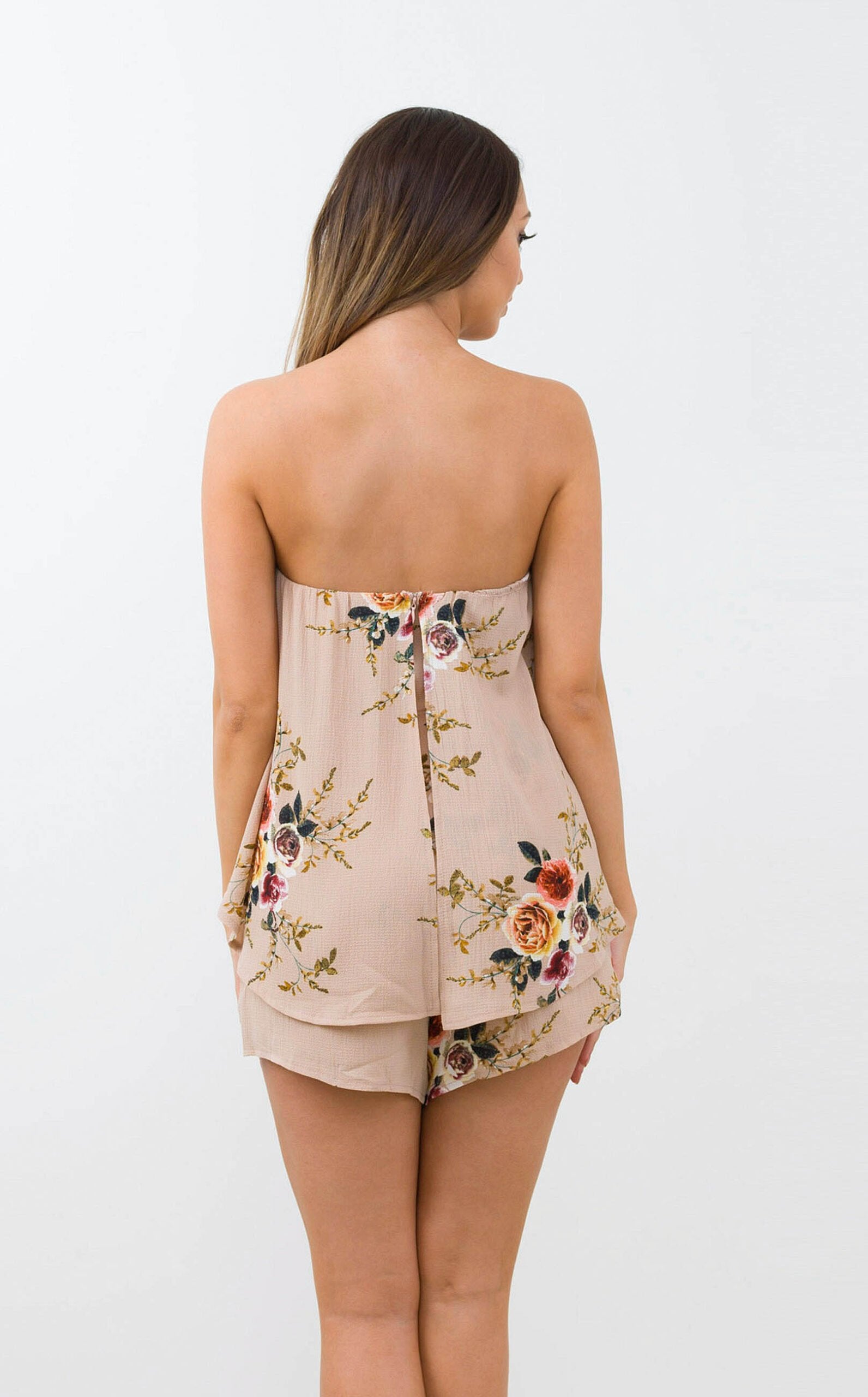 This strapless playsuit has a long frill on front to back with a floral print and has an invisible back zipper.