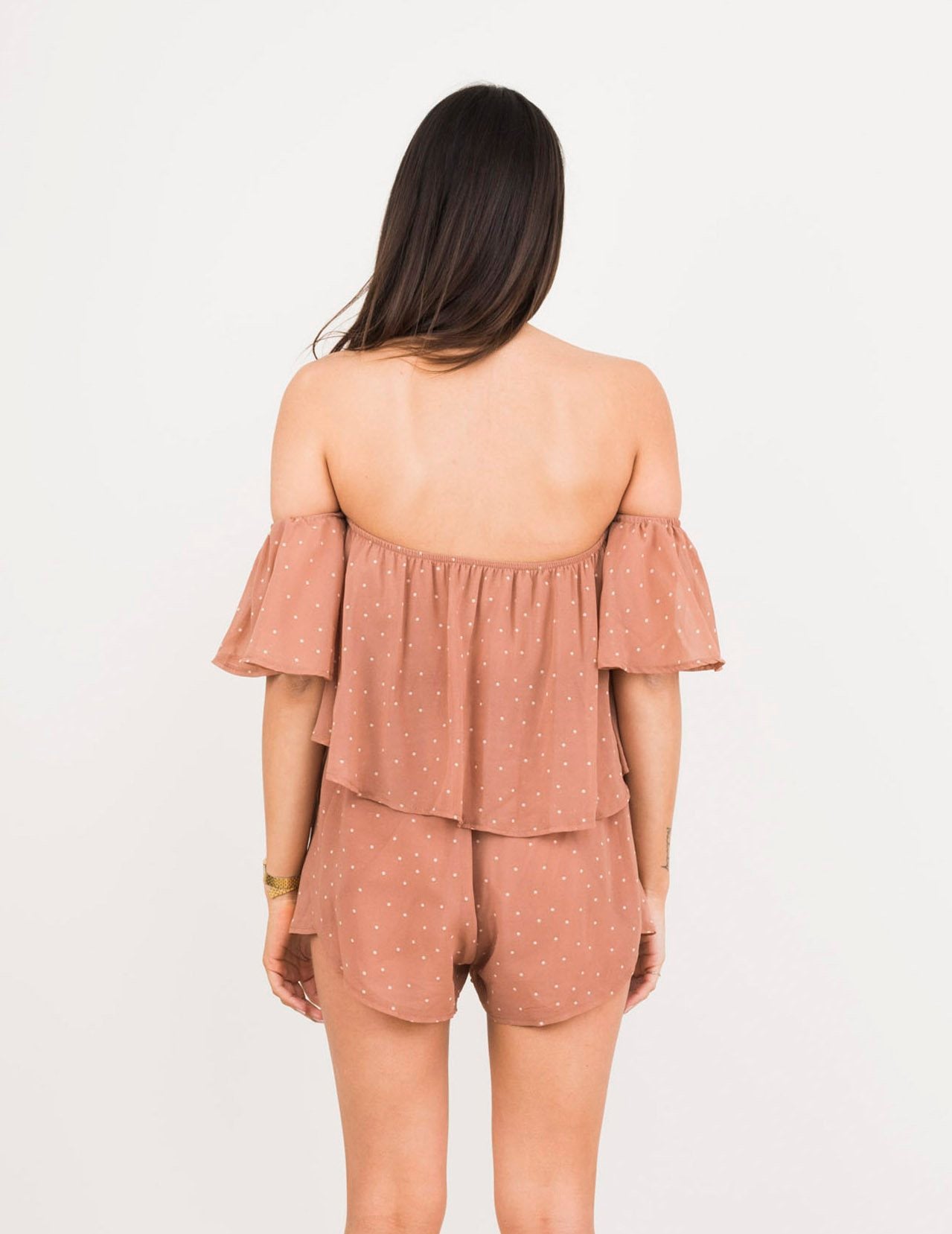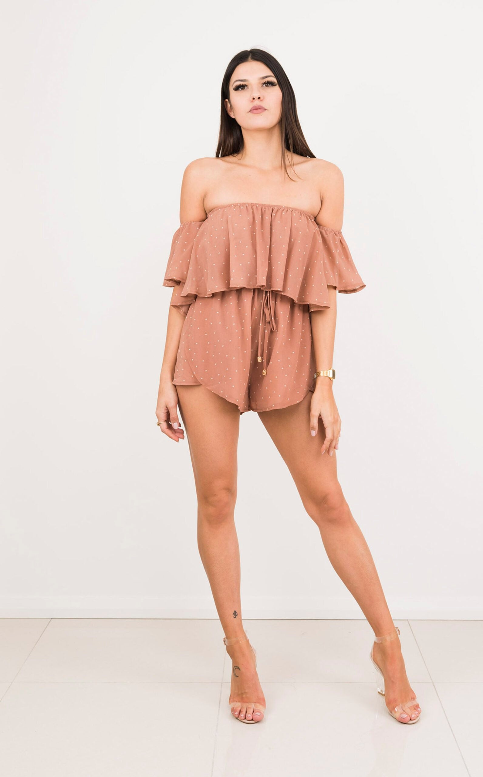 This cute playsuit has a stretchy waist line, frills on front and back and scattered sleeves.