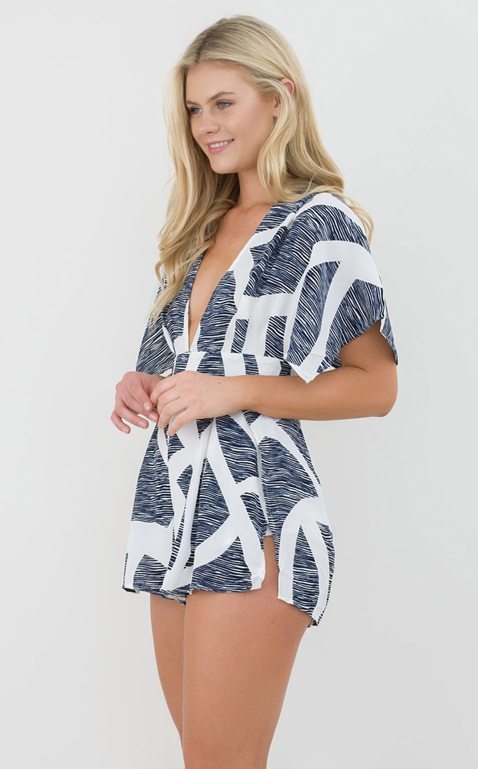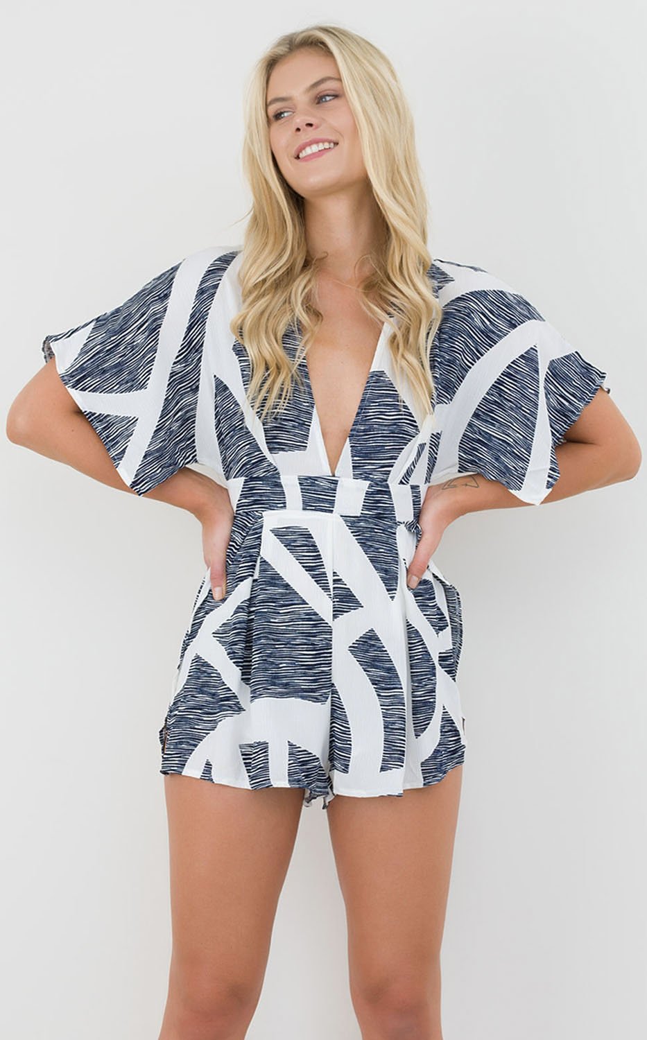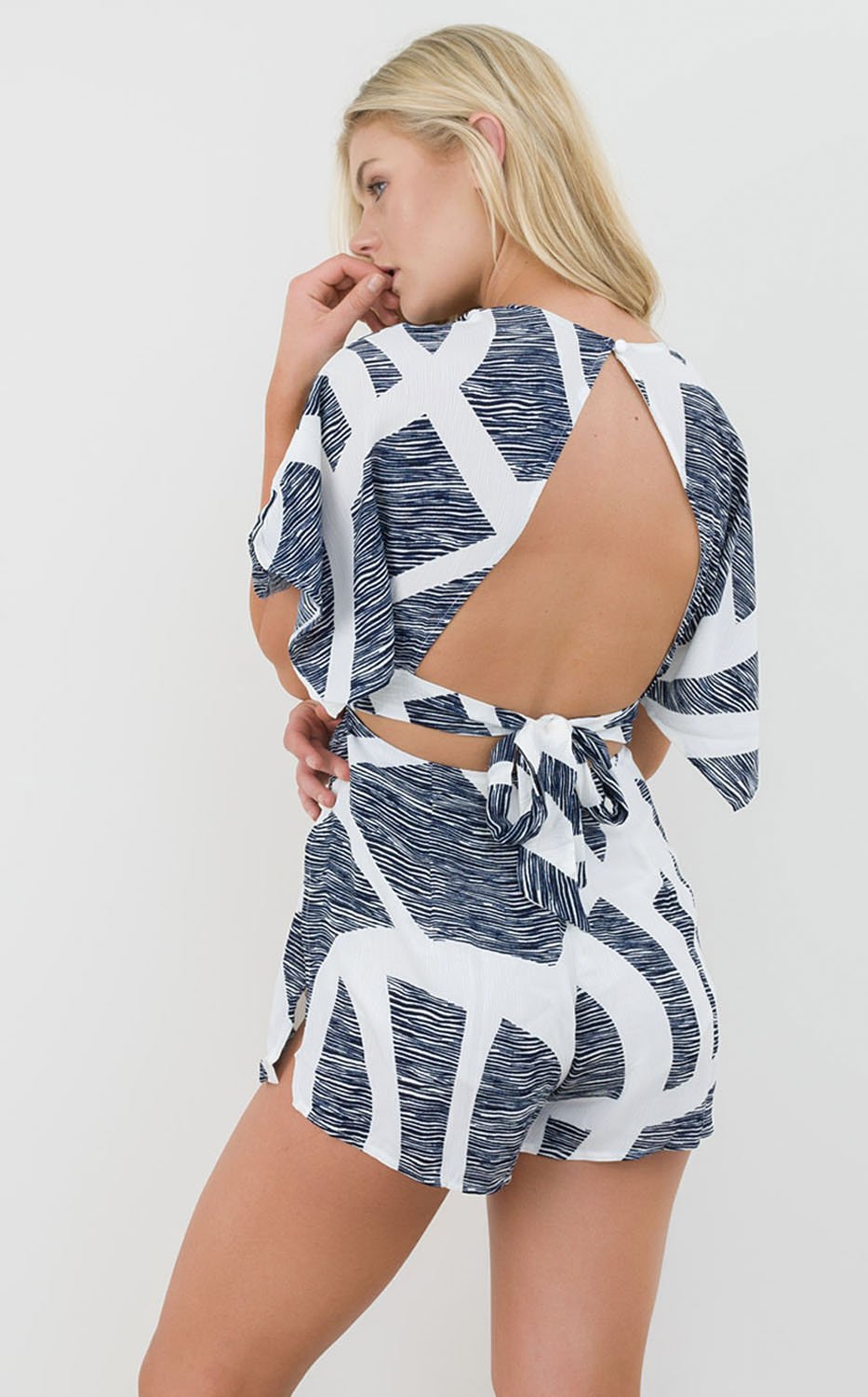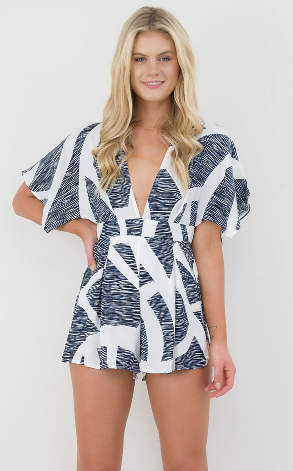 This flattering playsuit is a perfect party attire and has a cute tie up at the back, scattered sleeves and a v neckline.