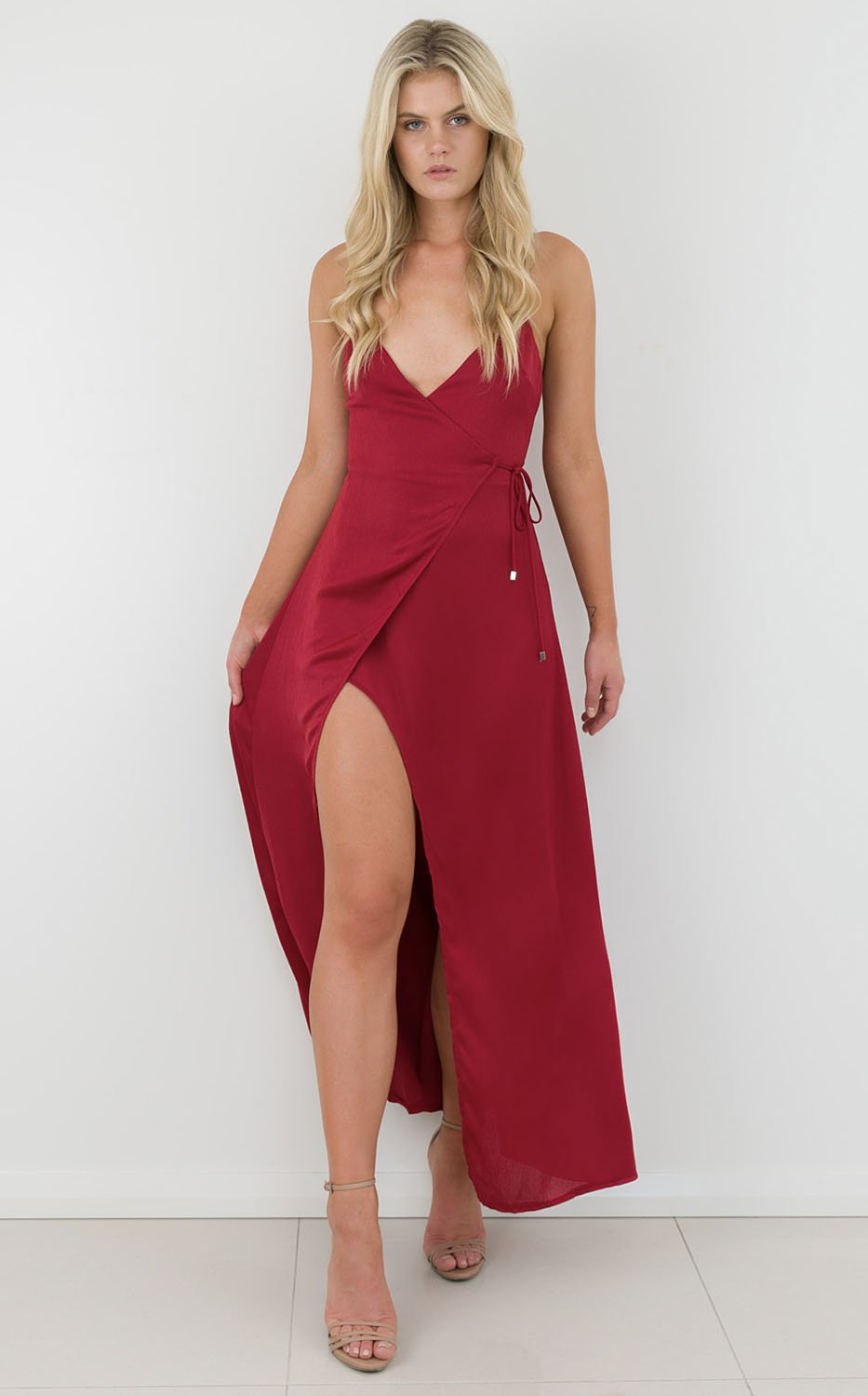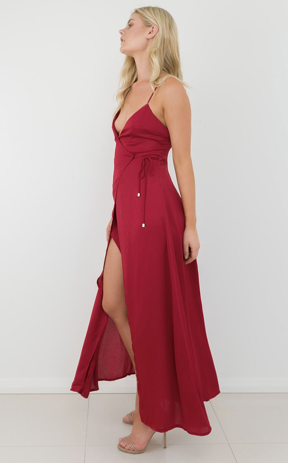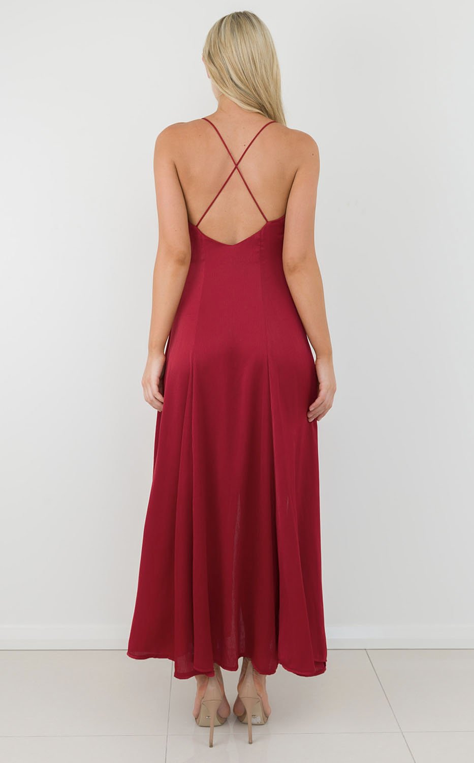 Our California Waiting Dress has a V neckline, crossover straps on the back and straps wrap around the waist. Wear it with black strappy heels.