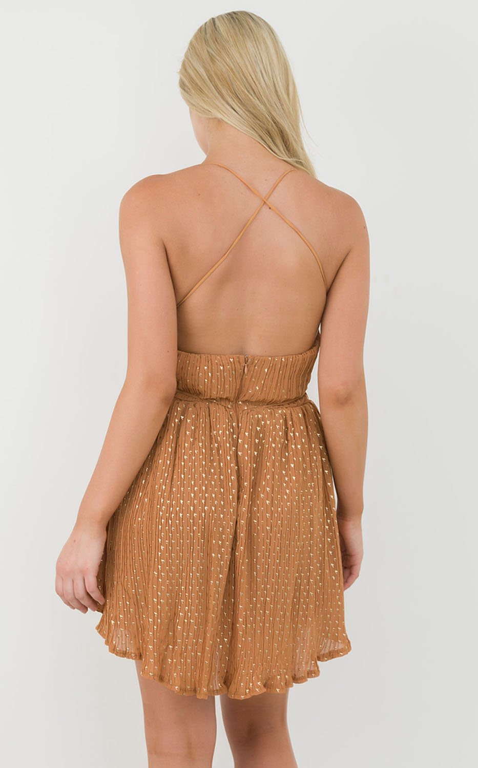 Our Be My Love Dress has a deep V neckline and crossover straps on the front and back. It also has an invisible zip at the back. The scatter details give it a flawless look. Wear yours with a pair of nude heels.