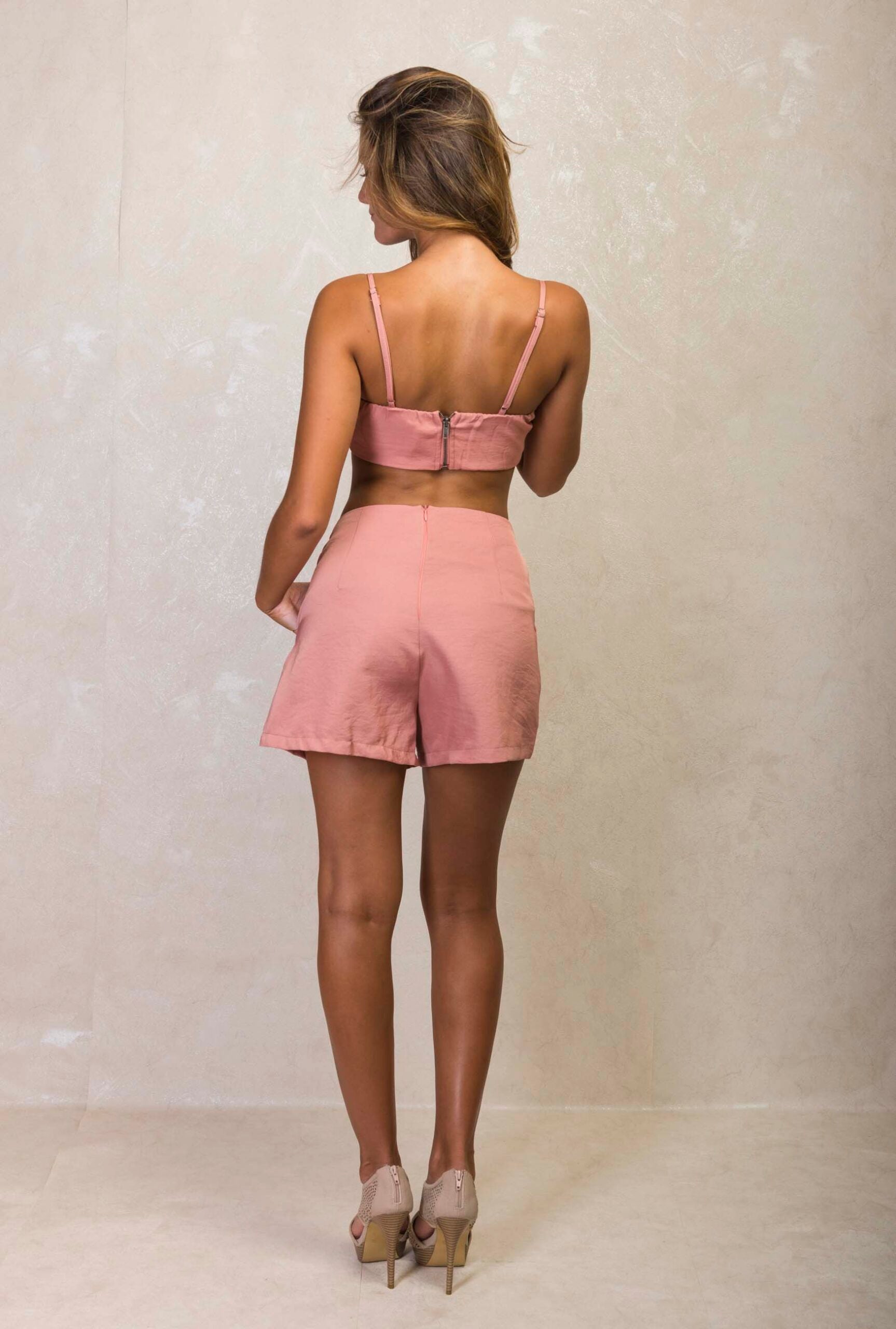 This two piece set is so gorgeous. The top has a sweetheart neckline, front tie and an exposed mettle zipper at the back. The short has side pockets and an invisible zipper at the back.