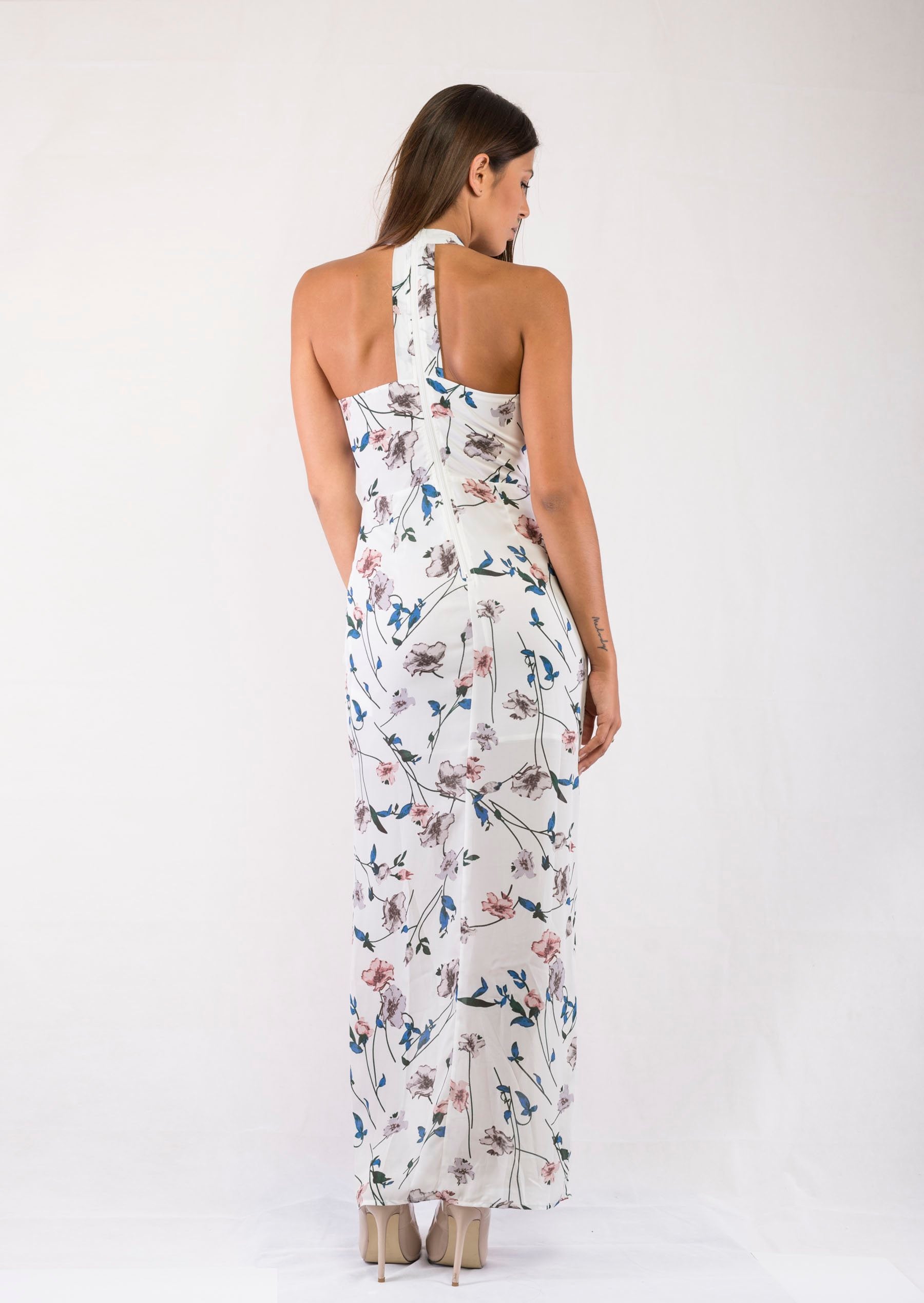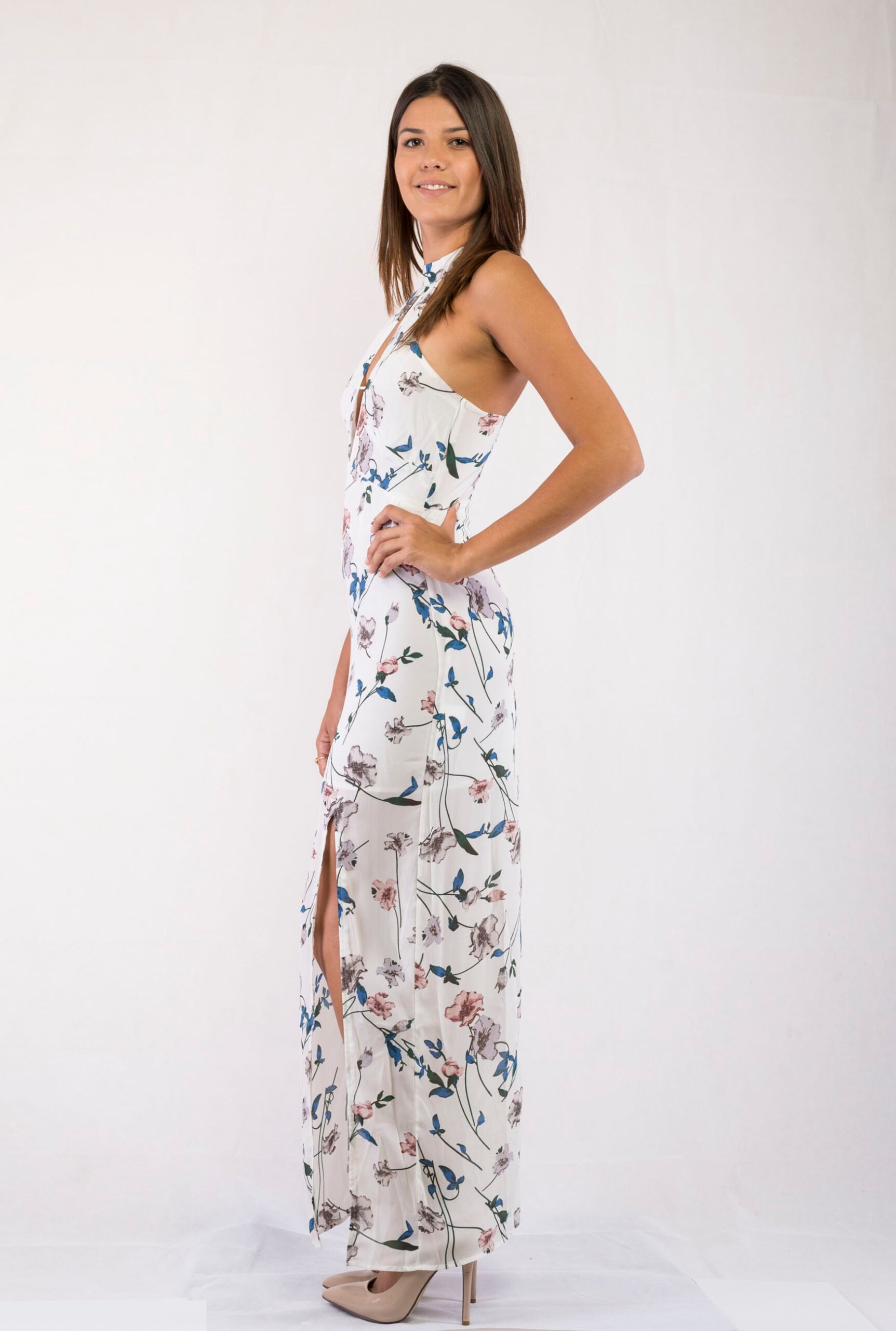 This stunning 'Summer Time' maxi with a romantic floral print is made of polyester, has a high neck design, centre split with strap detail, double front splits and a centre back zip.