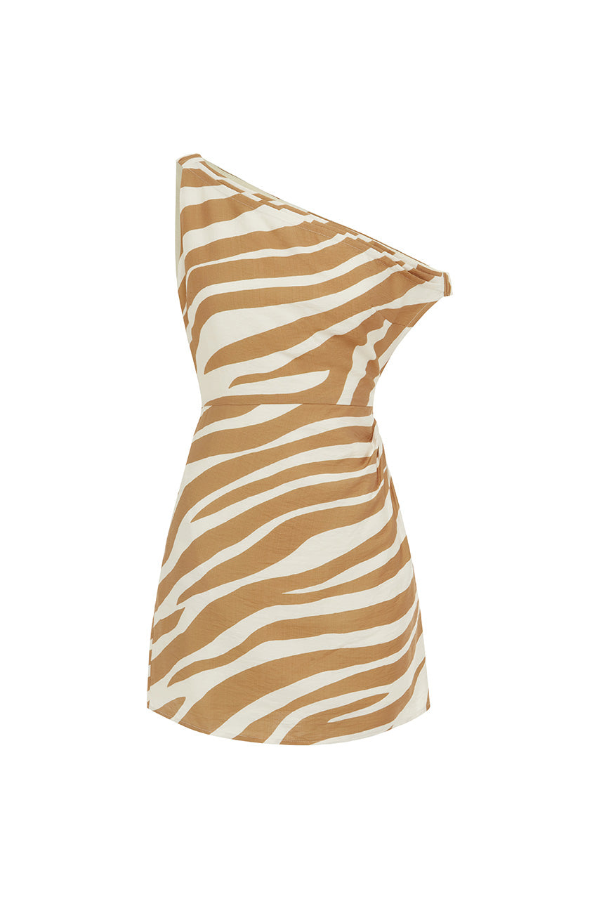 With a beautifully draped off the shoulder neckline and Zebra print, our Stefani Mini Dress is a great pick for your next brunch with the girls.
